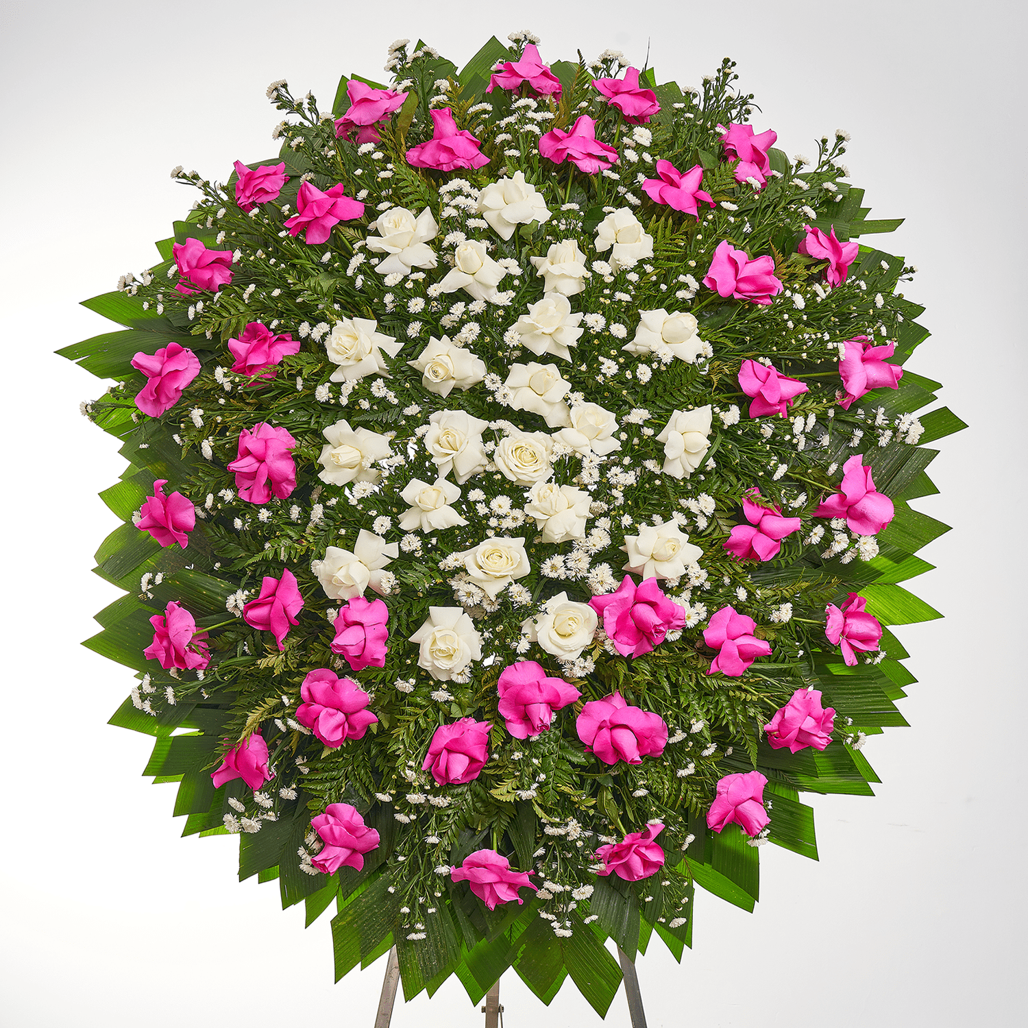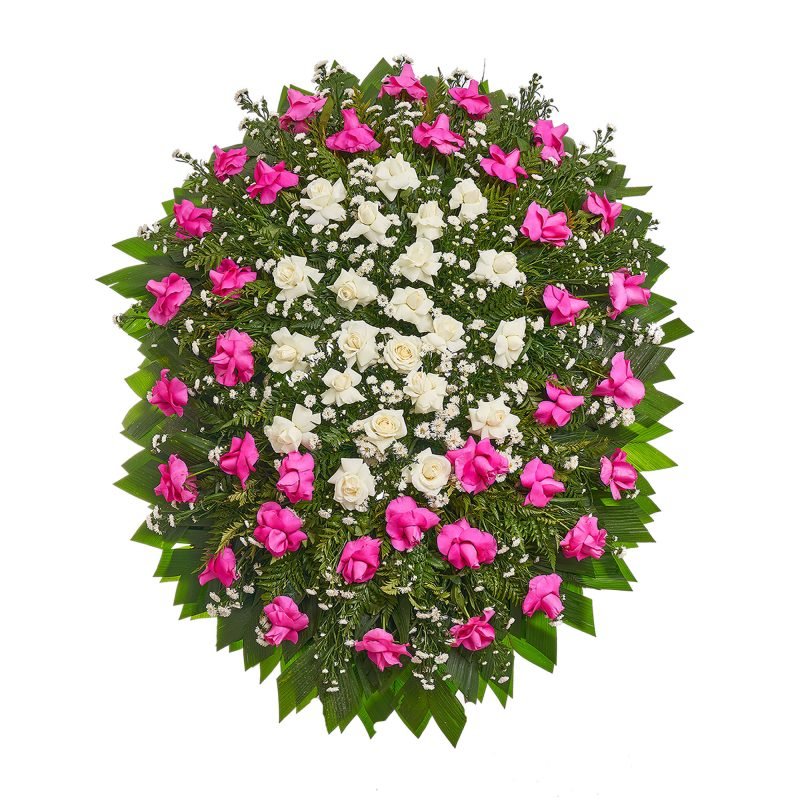 Coroa de flores confeccionadas com rosas , áster e folhagens , uma bonita composição de flores que expressa muito amor e emoção.